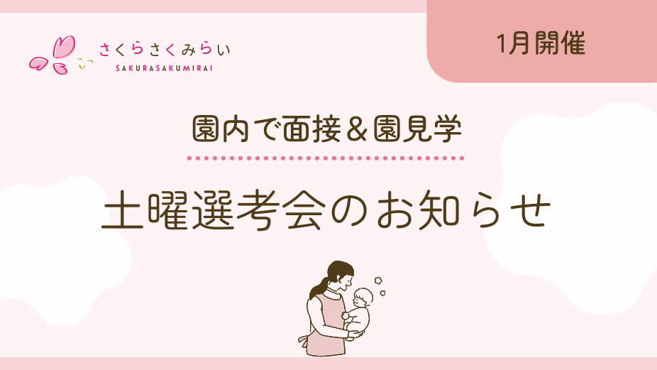 こんにちは。株式会社さくらさくみらい採用担当です🌸 さくらさくみらいでは毎週土曜日に園での選考会(面接と見学を同日実施)を行っています。園の雰囲気を実際に見て検討したい方など、ぜひご参加ください。皆様のご応募をお待ちしております♪ 実施日程 1月10日(土)9時00分~15時00分(15時00分最終…