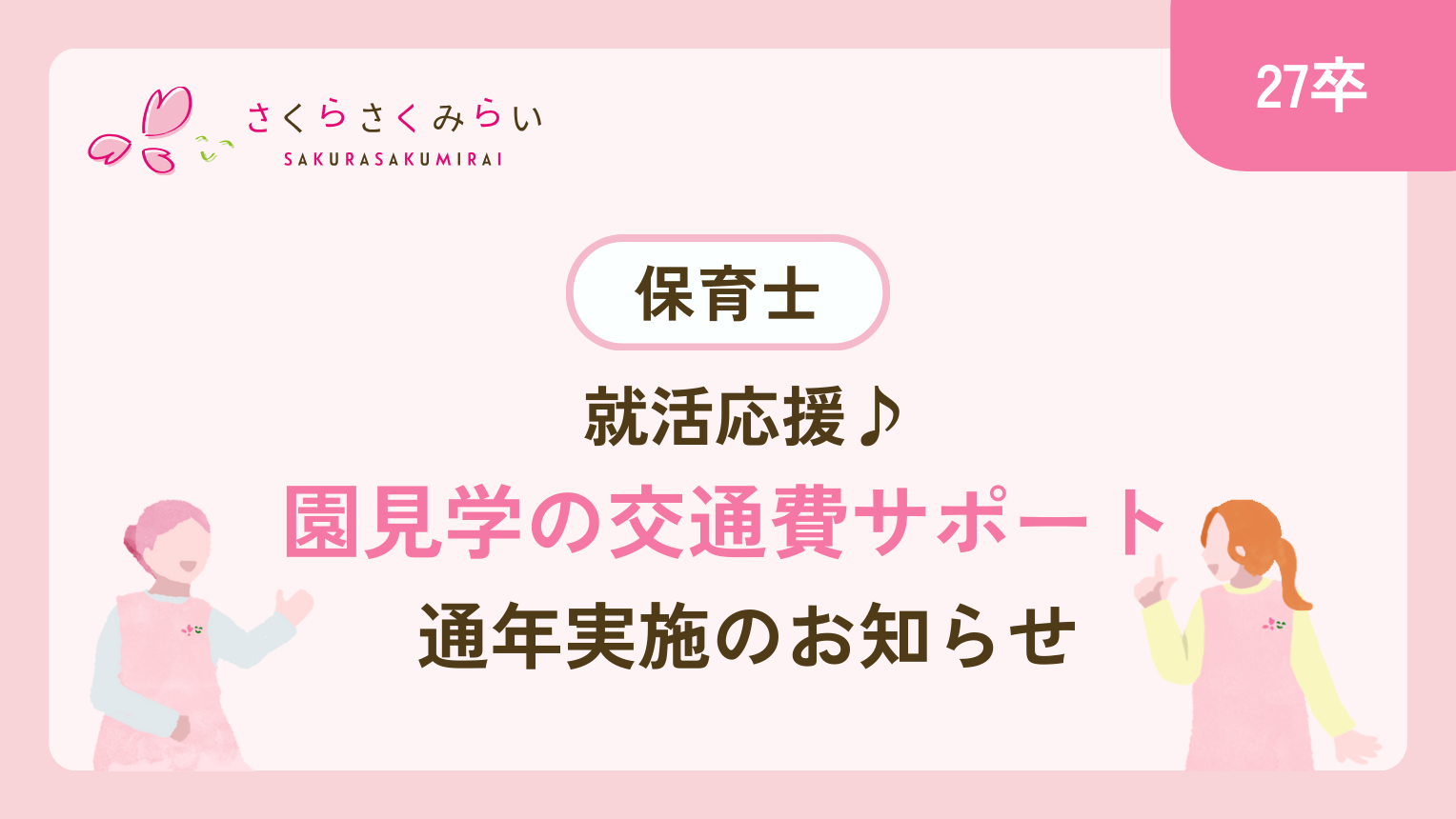 26卒採用において大好評をいただいた『交通費サポートキャンペーン』27卒採用ではなんと通年で利用可能となりました✨いつ来ても往復交通費が補助されるから安心♪みなさまお一人お一人のご予定にあわせて、東京都の園見学にお越しいただけます。ただし適用になる条件や注意点があるのでご確認くださいね📝 対象 以下の3つの条件をすべて満たす方 東京・神奈川・埼玉・千葉以外にお住まいの27卒保育学生 東京都内の園を見学または保育体験をした方 このHPからご予約された方 期間 2月2日(月)~翌2027年2月26日(金)※土曜日は応相談※日曜祝日、年度末、年度初め、年末年始など見学不可日あり 注意事項 サポート上限額 ¥50,000 振込は見学月の翌月末 見学当日に、宛名「株式会社さくらさくみらい」と記載された往復分の領収証原本の提出が必須 東京に滞在する期間は問いません サポート利用は1回限り お申込みはこちらから