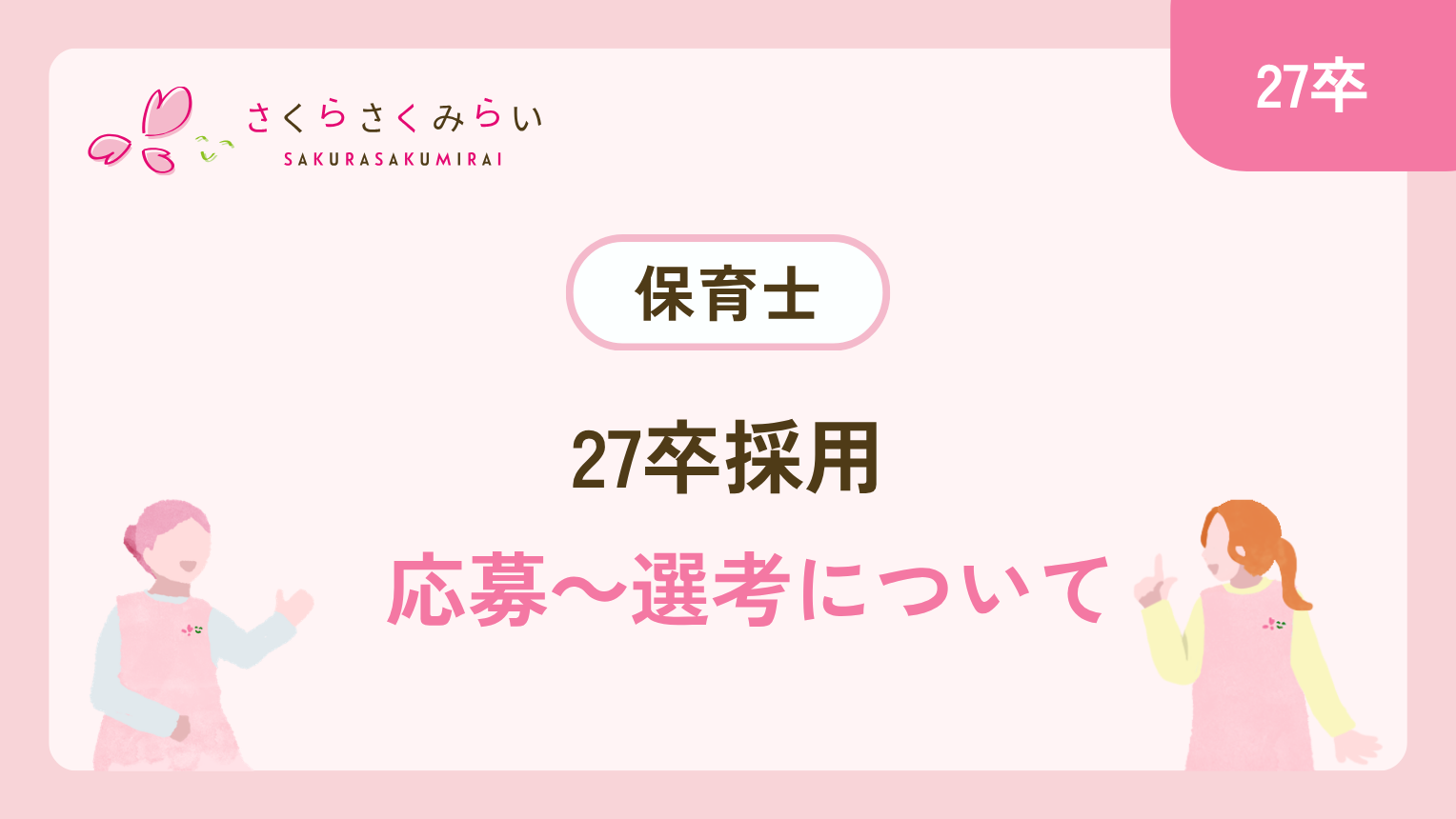 さくらさくみらいにご興味をお持ちいただきありがとうございます。 応募要件 下記2点を満たす方 園見学またはWEB説明会にご参加済み 2027年3月の卒業までに保育士資格を取得予定 選考概要 🌸面接(30~40分) 🌸作文(15分) テーマにあわせて150文字以上260文字以内 選考申込みの流れ 予約フォームにて希望日を入力する 採用担当から日時確定の案内メールが届く 2のメール内容に従って必要書類を準備する 書類を郵送する 面接対策が不安な方は必見 ☞履歴書&面接対策講座面接官が知りたい内容や履歴書の書き方&面接中のポイントもお伝えします! 応募に必要な書類 履歴書 卒業見込み証明書 資格取得見込み証明書 成績証明書 ※まだ証明書が発行できない場合は履歴書のみで構いません。 <送付先>〒100-0006 東京都千代田区有楽町1丁目2番2号 東宝日比谷ビル 6階株式会社さくらさくみらい新卒採用担当宛て ☞よくあるご質問はこちら お問い合わせ ✉ shinsotsu@sakura-39.jp℡ 03-6457-9539LINE さくらさくみらい新卒採用