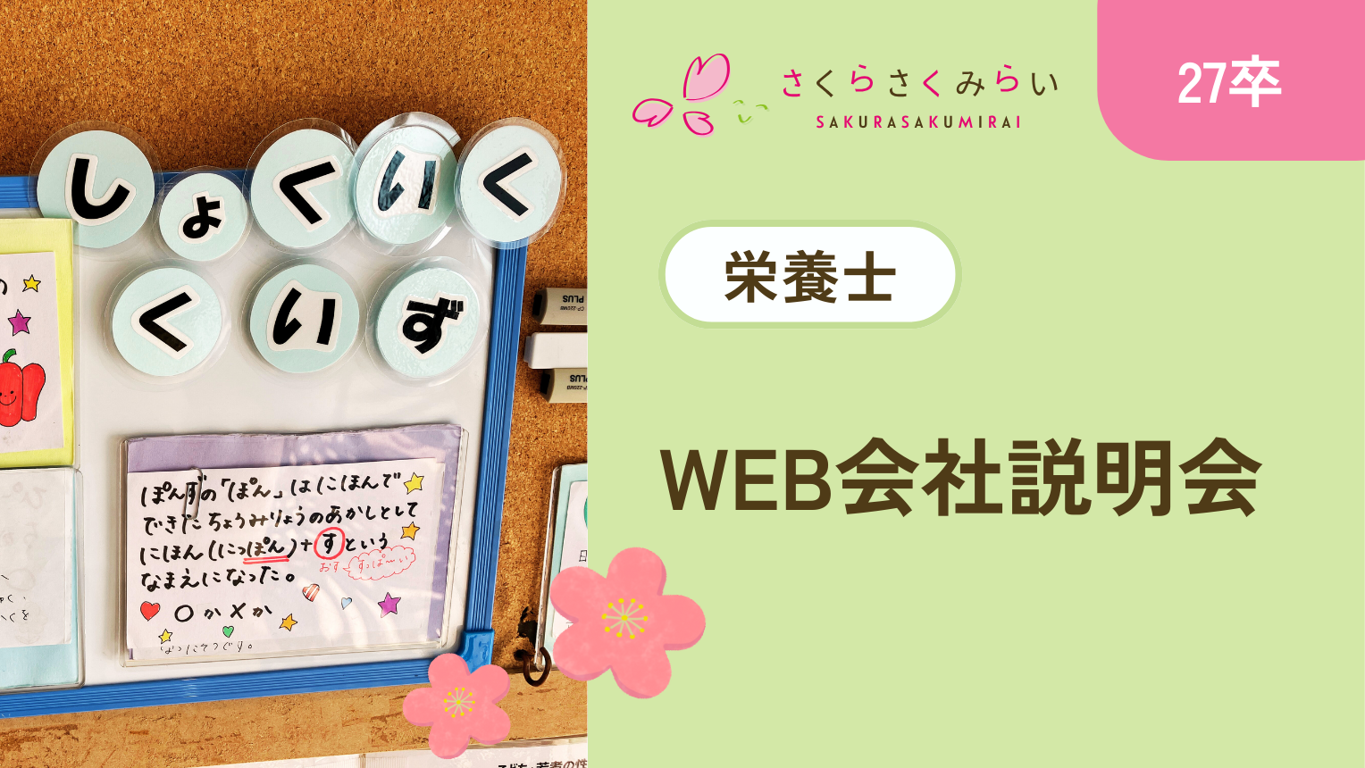 オンライン(zoom)で保育園栄養士の業務内容やさくらさくみらいのことをお伝えするセミナー(所要時間:40分)。27卒以降の業界・職種研究をしたい方、保育業界の傾向を知りたい方にピッタリの内容です。職員インタビュー動画も♪※1/15より『27卒栄養士会社説明会』を開催するため、オープン・カンパニーは1/9の回で終了いたします。