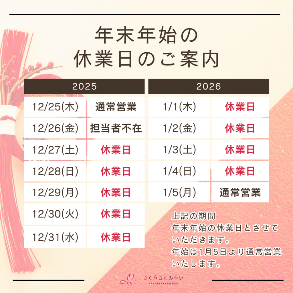 年末年始休業期間に伴い、12/26(金)から1/4(日)まで新卒担当が不在となります。12/26(金)~1/4(日)の期間内につきましてはメール・LINEのご返信および電話対応ができかねます。休業期間中にご予約いただいた方へのご案内や、お問い合わせに対するご返信は1/5(月)以降順次対応させていただきます。ご迷惑をおかけしますが、どうぞよろしくお願いいたします。