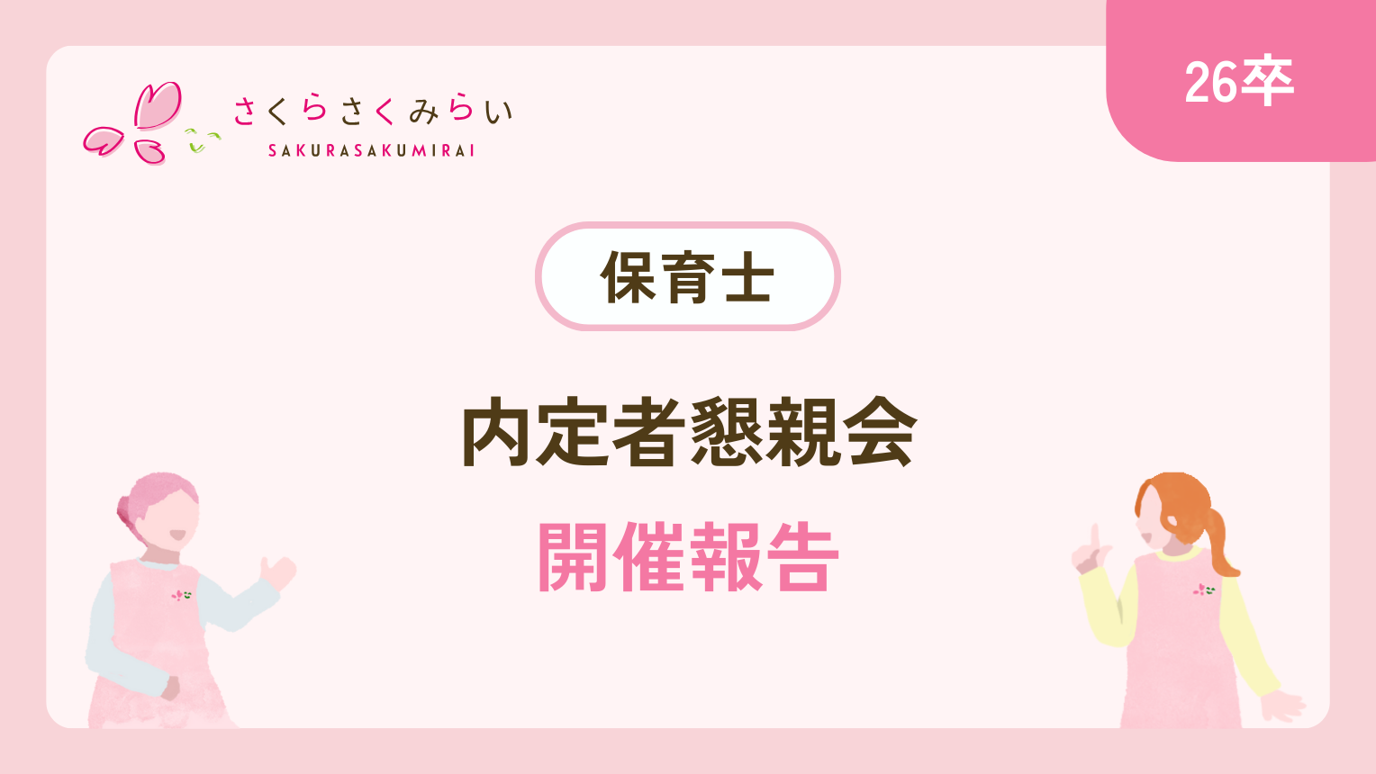 12月13日(土)、26卒保育士の内定者懇親会を開催しました✨ 内定者の顔合わせ 10月の内定式に参加していない方が半分以上ということもあり、ほぼ皆さん「はじめまして」という状況!ドキドキしている様子がこちらにまで伝わってくる中、まずはグループごとに自己紹介をしながらアイスブレイクをしました。 テーマに沿って話し合ってみよう 続いてグループワーク。色々と話していくうちに少しずつお互いの雰囲気や人となりが感じられるようになってきました😊 さらに交流を深めよう 席替えをして、また新しい顔ぶれでグループワークをしていきます。今回はとあるルールに基づき、内定者同士が協力して席順を探るというミッションが!果たして結果は・・・? 身体も動かそう 頭を使うグループワークが続いたので、ちょっぴり身体を動かすゲームも。じゃんけんをして勝った人が相手のサインを集められるというもの✊✌✋サインを集めるだけでなく自己紹介も兼ねるので、思わぬ共通点が見つかったりして盛り上がりました♪ 入社に向けて 「学生と社会人の違いは?」「保育士に大事なことって?」そんなテーマについても話し合ったり入社までの具体的なスケジュールを確認して、社会人になるという実感も少しずつ出てきたかと思います。初めのうちは学生時代とは違うことに折々で戸惑いを覚えるかもしれません。「責任も重くなるんだな」とプレッシャーに感じることもあるかもしれません。ですが、“社会人だからこそできる経験”や、“社会人だからこそ感じられる感情”もたくさんあります✨それをだんだんと見つけていけるといいのかなと思います😊