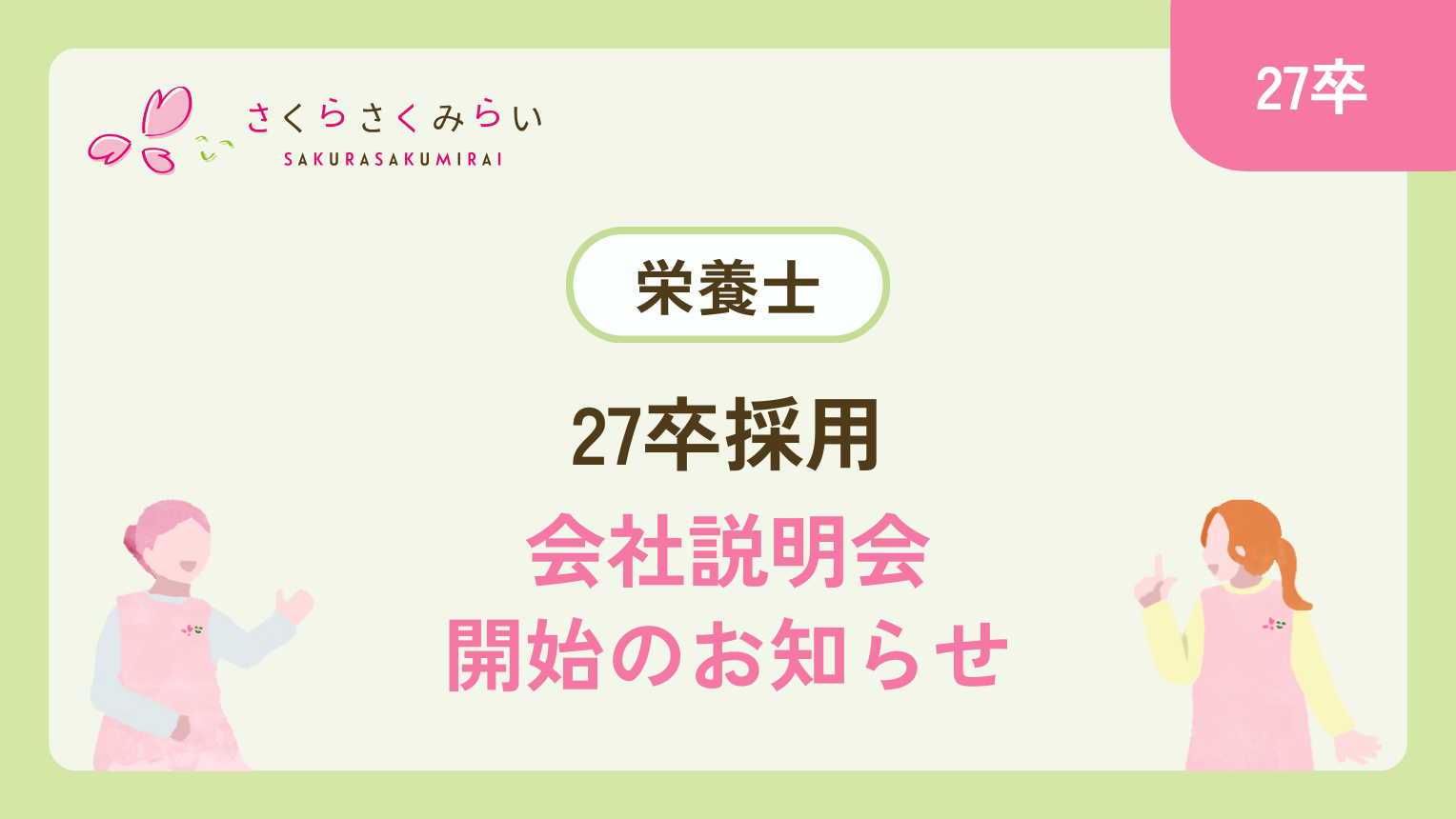 いよいよ1月より、27卒栄養士採用に向けた会社説明会を開始する運びとなりました!🌟週1~2回程度開催予定です。ご都合が合わない場合はお気軽にご相談ください。平日9:30~17:30の中で調整いたします。 概要 会社概要/栄養士の業務/食育/研修/福利厚生/募集要項/一人暮らしサポート(借上げ社宅制度)/職員インタビュー動画 など≪所要時間45分程度≫≪オンライン開催≫ こんな方におすすめ さくらさくみらいを詳しく知りたい 保育園栄養士に興味がある 料理をふるまうのが好き 食育に興味がある 仕事もプライベートもバランスよく過ごしたい メリハリある働き方が理想 募集対象 2027年3月末に四年制大学を卒業見込みかつ卒業までに栄養士資格を取得見込みの方 詳細・予約はこちら